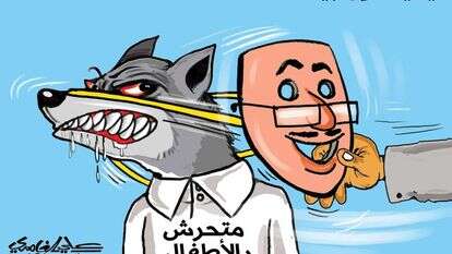הכותרת: יַעִישוּן בַּיְנַנַא – חיים ביננו. הזאב הוא מֻתַחַרִש באלאַטְפַאל – פדופיל (מילולית: מטריד ילדים). הוא חושף את שיניו, ופיו נוטף ריר ותאווה.