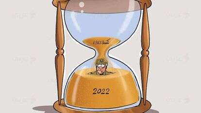 מה רצה הקריקטוריסט העזתי ד"ר עַלַאא' א-לַקְטַה להראות בקריקטורה הזאת? האם שעון החול מסמל שזמנה של ישראל אוזל, שהיא טובעת וגורלה נחרץ?
