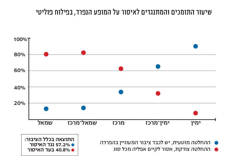 בפילוח מצביעים אידיאולוגי נראה כי רוב מוחלט של מצביעי הימין מתנגדים להחלטה לאסור על ההפרדה, בעוד רוב מצביעי השמאל מצדדים בה. ככל שהנטייה של המשיב לימין רבה יותר, כך הוא מתנגד יותר להחלטה.