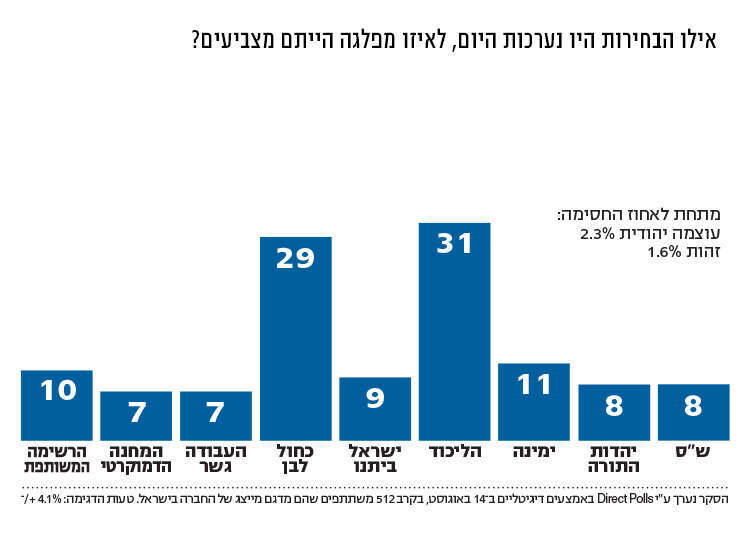 תמונת המצב הפוליטית כפי שעולה מהסקר לא זזה - רמז אפשרי לעניין שמגלים אזרחי ישראל הנופשים במערכת הבחירות. מהסקר עולה כי הליכוד זוכה ב־31 מנדטים ולמעשה מתחזק מעט, כחול לבן עם 29, ש"ס ויהדות התורה (8 כל אחת) שומרות על כוחן וגם השאר כמעט אינן זזות. המחנה הדמוקרטי מקבל 7 מנדטים, וכך גם העבודה־גשר. רשימת ימינה מקבלת 11 מנדטים, אף שבליכוד פתחו במלחמה על כל קול בקרב מצביעי הימין, בחלוקה הבין־גושית הימין זוכה ל־58 מנדטים והמרכז־שמאל ל־53. בלי הרשימה הערבית, שנוטה לא להמליץ על אף אחד מהמועמדים, זוכה גוש השמאל ל־42 מנדטים. בשלב זה נראה שאנחנו מתקרבים שנית להרכבת ממשלה קשה, בלי 61 מנדטים לאף אחד מהגושים.
