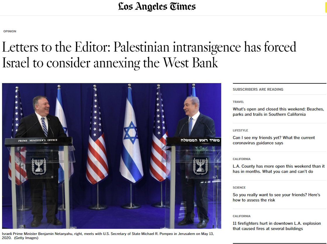 אולם חלק מהקוראים מתנגדים לעמדה הזאת: בלוס-אנג'לס טיימס, בתגובה לכתבה שהזהירה מפני הסיפוח, כתב אחד הקוראים, פרד באומן מאוהיו, מכתב למערכת. "ראשית, סיפוח, חכם או לא, אינו הורג את פתרון שתי המדינות", הוא קבע. "סירובם של הפלסטינים לקבל את קיומה של ישראל עשה זאת, וגרם לסיפוח להיראות כדרך היחידה. שינוי אמיתי, כמו זה של נשיא מצרים דאז אנואר סאדאת בשנות השבעים, יפתח את האפשרות הזאת שוב. שנית, שליטת ישראל בבקעת הירדן תמיד הוכרה כהכרח אסטרטגי לשלום יציב. אופן סיפוחה יכול לעלות מתוך המשא ומתן - שהרשות הפלסטינית מסרבת לו בעקשנות".