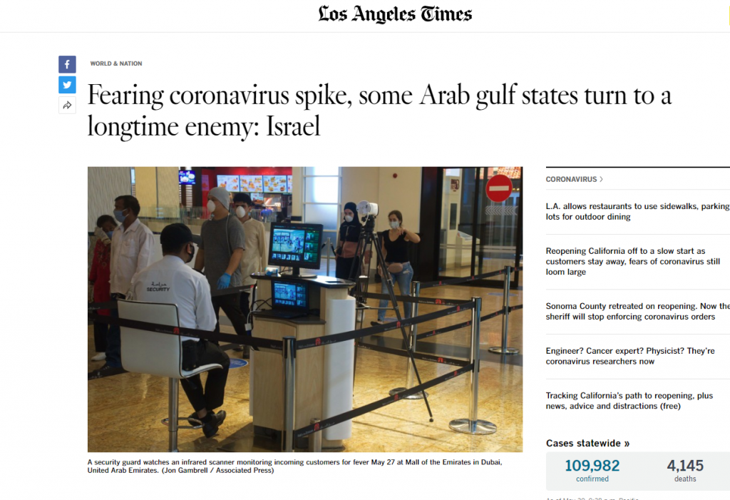 כתבה גדולה של הלוס-אנג'לס טיימס, מאת הכתבת נגה טרנופולסקי וכתב העיתון בביירות נביה בולוס, הציגה ביום חמישי שעבר את "דיפלומטיית הקורונה" של ישראל: אומות ערביות פונות לעזרה ממדינת האויב הציוני שהם כלל לא מכירים בקיומה. ראש החטיבה הבינלאומית בבית החולים שיבא, יואל הר-אבן, סיפר לעיתון שבית החולים קיבל פניות מבחריין ואינדונזיה, שלא מכירות בישראל, ומירדן, מצרים ואזרבייג'ן, שכן מכירות בה.