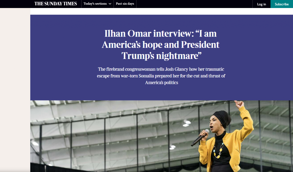 חברת הקונגרס האנטישמית אילהאן עומאר התראיינה בסאנדיי טיימס ביום ראשון שעבר. הכתב ג'וש גלנסי שאל על התבטאויותיה האנטישמיות: בעבר טענה עומאר שיהודי ארה"ב "מקדמים נאמנות למדינה זרה", שישראל "הפנטה את העולם" ושהתמיכה האמריקנית בישראל קשורה ל"בנג'מינים" (לא בנימין נתניהו אלא בנג'מין פרנקלין, המופיע על שטר מאה הדולרים). עומאר השיבה לגלנסי: "ההתבטאות שלי הכאיבה לאנשים, וזה שבר את ליבי. אני מדברת על הכסף הסעודי המדמם ועל זה שהסעודים הם מוצצי דם, ואף אחד לא אומר 'זה אסלאמופובי'. אבל אני יודעת שאם אשתמש במונחים האלה כלפי מדינה אחרת, זאת תהיה בעיה... ההיסטוריה קשורה למילים... אני מבינה זאת עכשיו".
