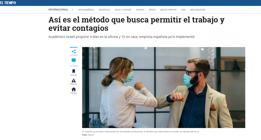 דיווחים קולומביאניים אחרים על ישראל עוסקים בקורונה. העיתון "אל טיימפו" דיווח בשבוע שעבר - דרך העיתון הספרדי ABC - על הצעתו של פרופ' אורי אלון ממכון ויצמן לעבור למשמרות של ארבעה ימי עבודה ו-10 ימי עבודה מרחוק. לפי אל טיימפו, השיטה כבר מיושמת בכמה חברות בעולם. אולי כדאי שגם אנחנו נלמד מעצמנו?