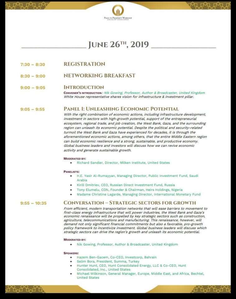 מקורבים לגרינבלט וקושנר אומרים שהם סבורים שהאירוע בשבוע הבא עדיין יכול להירשם כהצלחה. אם שרי האוצר ממדינות האזור ואנשי העסקים שיפקדו את הכינוס יביעו נכונות להשקיע במיזמים ובתוכניות לפלסטינים, יופעל לחץ על המערכת הפלסטינית. הרי "ישראל קיבלה דברים טובים, עכשיו תור הפלסטינים לקבל משהו", אמר כבר לפני חצי שנה הנשיא טראמפ.