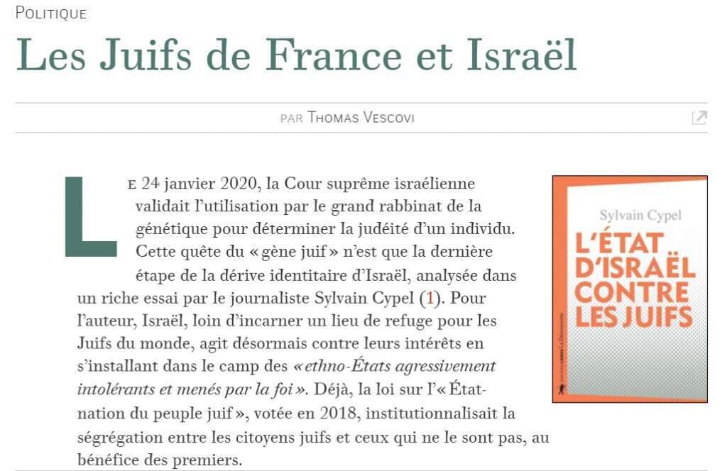 דיווחי החדשות על ישראל בעולם דובר הצרפתית עסקו בשבוע האחרון בהתקדמות הדיבור על סיפוח, בחשד ל"גל שני" של מגפת הקורונה, ובהריגתו השגויה של איאד אל-חאלק. כמו אצלנו. מה שהרגיז אותי, עם זאת, היה אזכור של ישראל בביקורת ספרות קצרה במגזין "לה מונד דיפלומטיק": תומס וסקובי כתב על שני ספרים שטוענים שישראל גורמת נזק ליהודי העולם כשהיא נאבקת להבהיר שמי שמתנגד לציונות, זכות ההגדרה העצמית של יהודים, הוא אנטישמי.