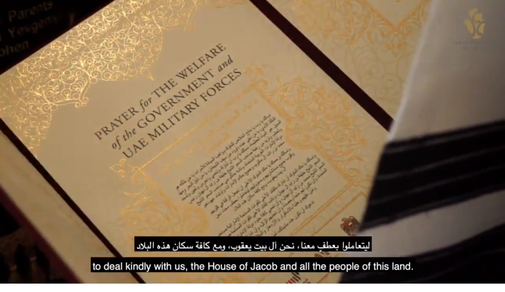 החזן מברך בתפילה את הוד מעלתו שייח' חליפה בין זאיד אאל נהיאן, ואת סגנו מוחמד בן ראשד אאל מכתום ועוד ועוד מנסיכי הכתר, על רקע תמונות אקזוטיות ויפות של בית כנסת, מדבר ועיר, דגל איחוד האמירויות, דיוקנאות הנסיכים למיניהם ועוד.