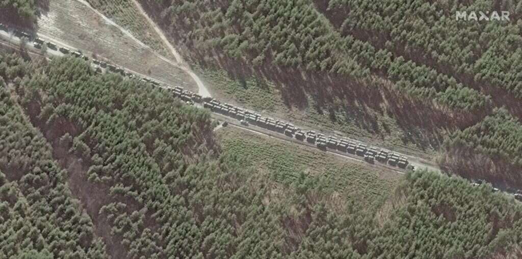 תמונות לוויין שפורסמו הבוקר (ג') מציגות שיירה עצומה של כלי רכב צבאיים רוסיים שעושה את דרכה לקייב מצפון. הצבא הרוסי הודיע לתושבי הבירה שהם יכולים "לצאת בחופשיות" מהעיר באמצעות כביש מהיר שנותר פתוח, ובכך רמז על הכוונה לתקוף גם מטרות אזרחיות.