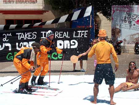 פעילי גרינפיס ייצרו היום סופת שלגים במרכז תל אביב, זאת כדי להזהיר מפני הסיכון שבשינויי אקלים, בעקבות הסרט היום שאחרי מח