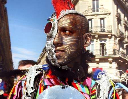 משתתף במצעד הטכנו השביעי בפריס מציג את תלבושתו שעשויה מבד, פלסטיק ומתכת