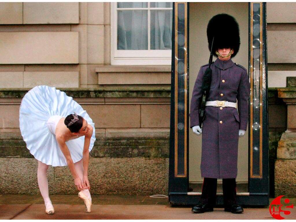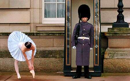 סימון קלארק רקדנית שמשתתפת במחזה מפצח האגוזים לכבוד חג הכריסמס. סימון מתרגלת את נעלי הבלט שלה אל מול המשמר המלכותי של המלכה בארמון בקינגהם בלונדון.