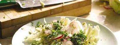 1/2 כרוב ירוק 4 בצלים ירוקים חופן עלי פטרוזיליה או ראשד קצוצים דק 8 צנוניות קטנות פרוסות דק פלפל שחור גרוס