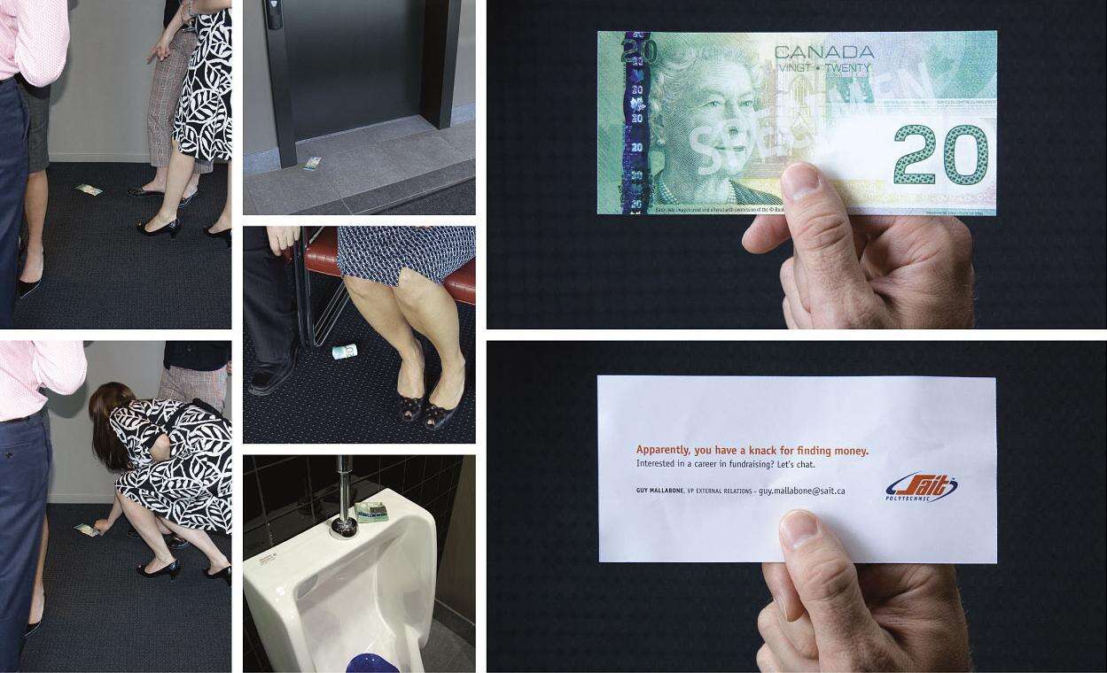 שטרות של 20 דולר קנדי פוזרו במהלך הועידה האחרונה לקידום החינוך בקנדה. השטרות הפזורים בוועידה קרצו לנוכחים, הרימו אותי וקנו לעצמכם משהו יפה. כאשר התכופפו באי הועידה להרים את השטר התגלה המסר שביקשה SAIT להעביר: תרמו לנו. לחצו כאן להגדלה.