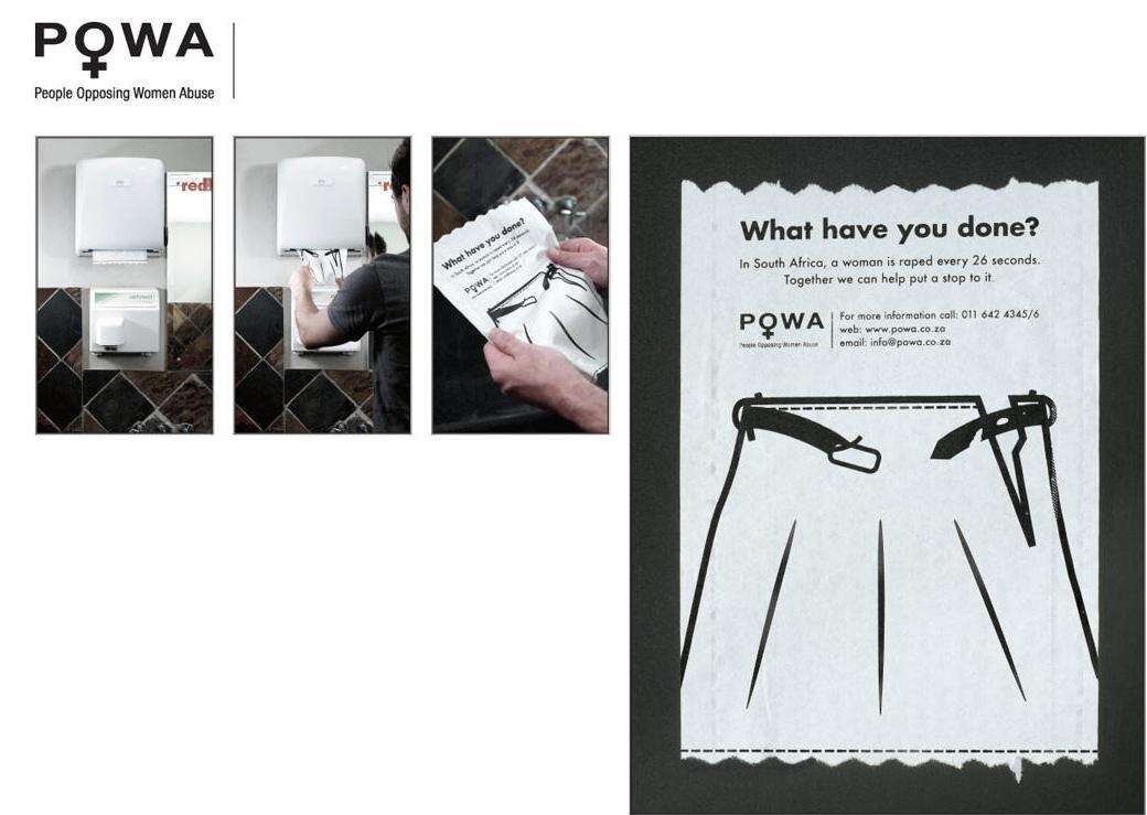 מגבות הנייר הוכנסו למתקנים ייעודים בחדרי השירותים במקומות הבילוי. על גבי מגבות הנייר הודפסה חצאית קרועה שנראה כאילו הורדה בכח, בדיוק כמו משיכת הנייר מהמתקן. לחצו כאן להגדלה.