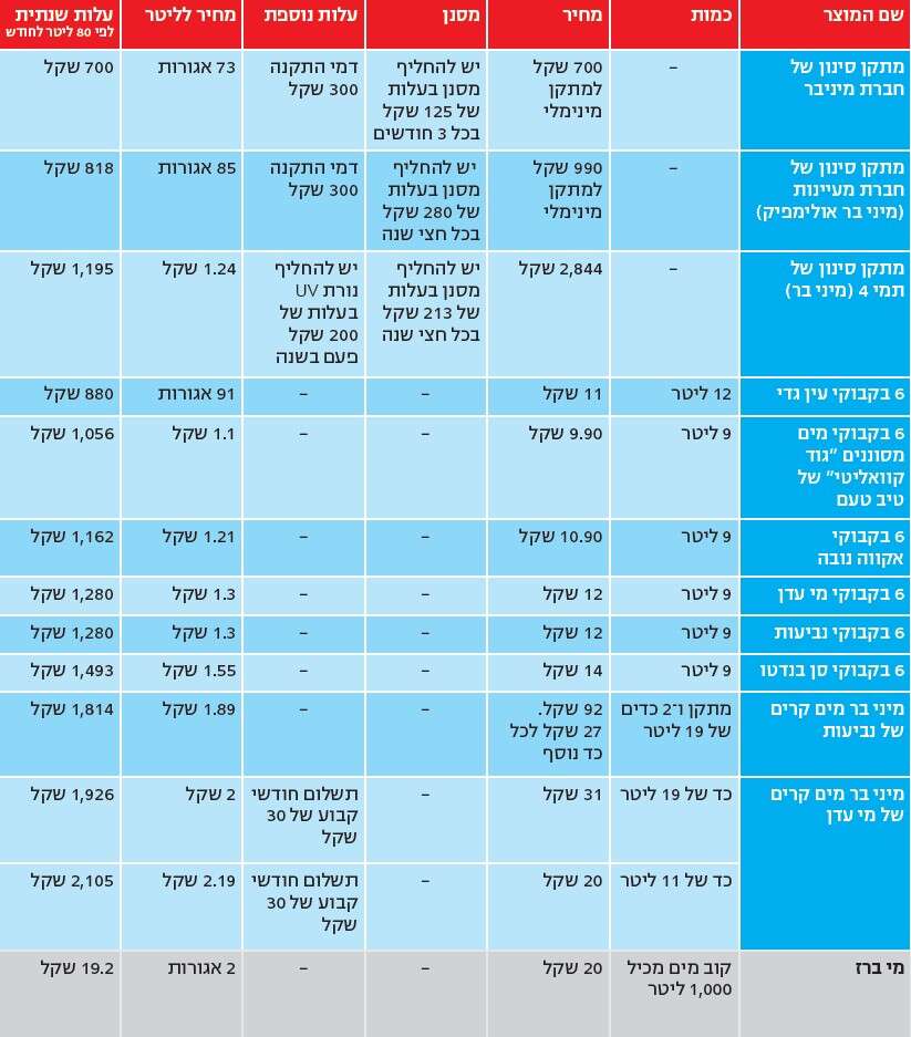 לא מדובר בעסק זול. כדי לבדוק כמה יעלה התענוג ערכנו בדיקה, שהתבססה על צריכה חודשית של 80 ליטר - כ-4 כדי מים מינרליים. בחישוב שנתי מגיעה הצריכה ל-960 ליטר לבית אב. במוצרים המחייבים רכישת מתקן חושב אורך חיי המתקן לפי 5 שנים, והעלות השנתית מהווה כחמישית ממחירו. לצריכה השנתית נוספו אלמנטים כמו עלויות ההתקנה, המסננים והרכיבים הנוספים שיש להחליף מדי 3-6 חודשים.