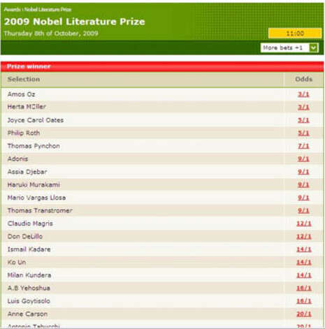 בשנה שעברה, 2008, היה עמוס עוז, מועמד ראוי לכל הדעות, מדורג שלישי ערב מתן הנובל, ביחס של 5/1. בראש הרשימה עמד, משום מה, ההוגה האיטלקי קלאודיו מגריס ביחס של 3/1, ואחריו המשורר והסופר הסורי-לבנוני החי בצרפת, אדוניס, ב-4/1. אחרי עוז הופיעו ברצף האמריקאים ג'ויס קרול אוטס ופיליפ רות (7/1 לכל אחד) ודון דלילו (1/10). גם הבא אחריהם, הרוקי מורקמי, זכה ליחס של 10/1. הזוכה, לה-קלזיו, היה מועמד ביחס של 1/14 כמעט עד לרגע האחרון.