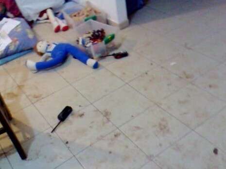 כתמי הדם וצעצועי הילדים בבית המשפחה בו אירע הרצח .