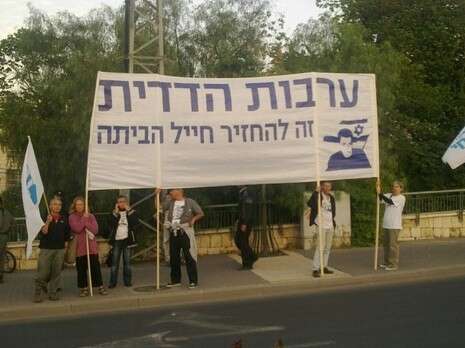 אמהות למען גלעד שליט אוחזות שלט בכניסה להר הרצל, הערב.