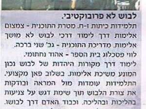 עוד נכתב במודעה "התלמידות עומדות מול המרה ובודקות את צורת הלבוש תוך שימת דגש על צניעות בהליכות ובהלכה, מטרת הסדנה להעלות למודעות את עוצמת ההופעה האישית ואת היכולת למנוע אלימות".