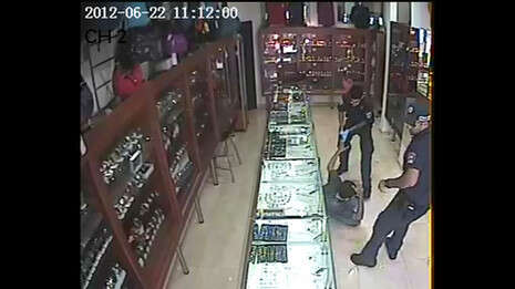 מנקודה זו תועד במצלמות האבטחה מעצר לגיטימי שהפך להתעללות פיזית מטרידה בחשוד חסר ישע. הצעיר דחף את דלת הזכוכית ואת אחת העובדות בחנות, החליק והשתטח על הרצפה.