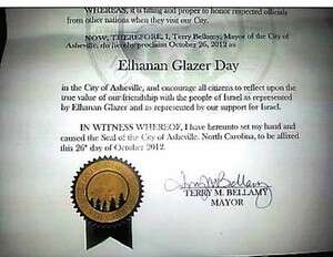 "הם יעשו ברחובות העיר ראלי למען ישראל ולכבוד גלזר. תזמורות יצעדו ברחוב ואחר כך יקיימו טקס גדול בבניין העיריה המקומית בנוכחות אישי ציבור ובישופים מכל צפון קרולינה, בו אקבל עיטור כבוד. בכל שנותיי בכנסת לא זכיתי לכבוד כזה".