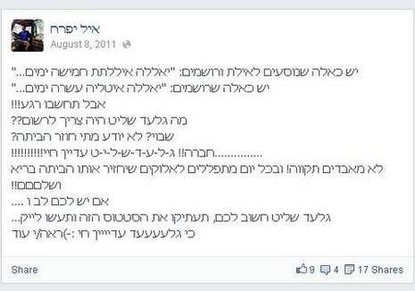 ''חמש שנים גלעד לא צחק''. הסטטוס של אייל יפרח בפייסבוק