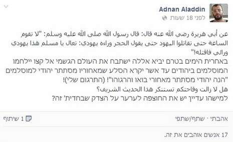עו"ד עדנאן עלאדין, פרקליט חיצוני בסנגוריה הציבורית, בחר לצטט בעמוד הפייסבוק שלו את החדית', הפסק המוסלמי, ואת תרגומו לעברית, האומר: "באחרית הימים בטרם יביא אללה ישתבח את העולם הגשמי אל קצו יילחמו המוסלמים ביהודים עד אשר יקרא הסלע שמאחוריו מסתתר יהודי למוסלמים "הנה יהודי מסתתר מאחורי בואו והרגוהו"! (התרגום שלי)!".