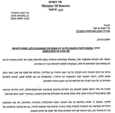 השר סער אמר היום (ג') כי ״שערי ישראל יהיו פתוחים בפני כל יהודי ומשפחתו ללא אפליה הנובעת מאורח חייו", תוקף ההחלטה מידי וכבר הבוקר קיבל הזוג הראשון מעמד של עולה בארץ.