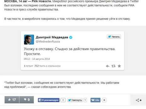 העוקבים של דימטרי מדבדב נדהמו לגלות ציוץ שבו כתב: "אני מתפטר ומתבייש בממשלה". ואז התברר: אלמונים פרצו לחשבון הטוויטר שלו