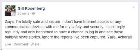 ג'יל רוזנברג הפריכה את החששות שהיא נמצאת בשבי דאעש. "חברים, אני בטוחה ומוגנת לגמרי. אין לי גישה לאינטרנט ולאמצעי תקשורת אחרים", כתבה לפני שעה קלה בעמוד הפייסבוק שלה. השמועות על חטיפת של רוזנברג התעוררו לאחר שאתר המזוהה עם "המדינה האיסלאמית" פרסם שישראלית נפלה בשבי הארגון במהלך הקרבות על העיר קובאני בסוריה.