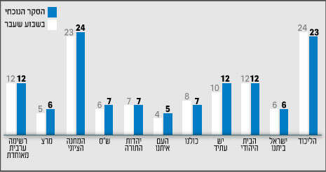 אחריה צועדת סיעת הליכוד עם 23 מנדטים, כשלמעשה היא שומרת על כוחה מהסקר הקודם. הבית היהודי, מפלגתו של השר נפתלי בנט, שאחד מבכיריה, השר אורי אורבך נפטר אתמול ממחלה קשה, מתייצבת על 12 מנדטים בדומה לשבוע שעבר וכך גם סיעתו של ח"כ יאיר לפיד "יש עתיד".