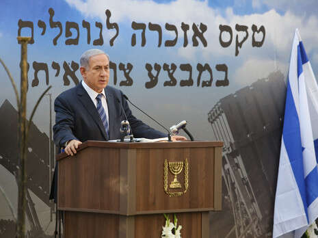 ''פשעי מלחמה''. בנימין נתניהו בעצרת לזכר הנופלים ב''צוק איתן'' צילום: גיל יוחנן