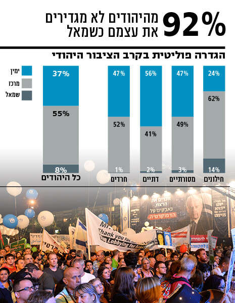 מבחינה פוליטית, מצא הסקר כי רק חלק קטן של 8% מהציבור היהודי בישראל מזהה את עצמו עם השמאל. בעוד בקרב החילונים התוצאה היא הגבוהה ביותר בתשובה לשאלה זו, אך עדיין עומדת על 14% בלבד. התוצאות מלמדות כי חרדים, מסורתיים ודתיים מזהים את עצמם בצורה דומה יחסית עם המרכז והימין, בעוד שהחילונים מזהים את עצמם בעיקר עם המרכז.