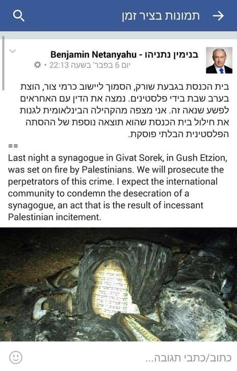 הצתת המבנה הזמני של בית הכנסת הביאה שלל גורמים מכל קצות הקשת הפוליטית לגנות את המעשה ולצאת נגדו בתקיפות. ראש הממשלה בנימין נתניהו התייחס להצתה ואמר כי על העולם לגנות את האירוע. "בית הכנסת הוצת בערב שבת בידי פלסטינים", כתב נתניהו בעמוד הפייסבוק שלו לאחר האירוע. "נמצה את הדין עם האחראים לפשע שנאה זה. אני מצפה מהקהילה הבינלאומית לגנות את חילול בית הכנסת, שהוא תוצאה נוספת של ההסתה הפלסטינית הבלתי-פוסקת".