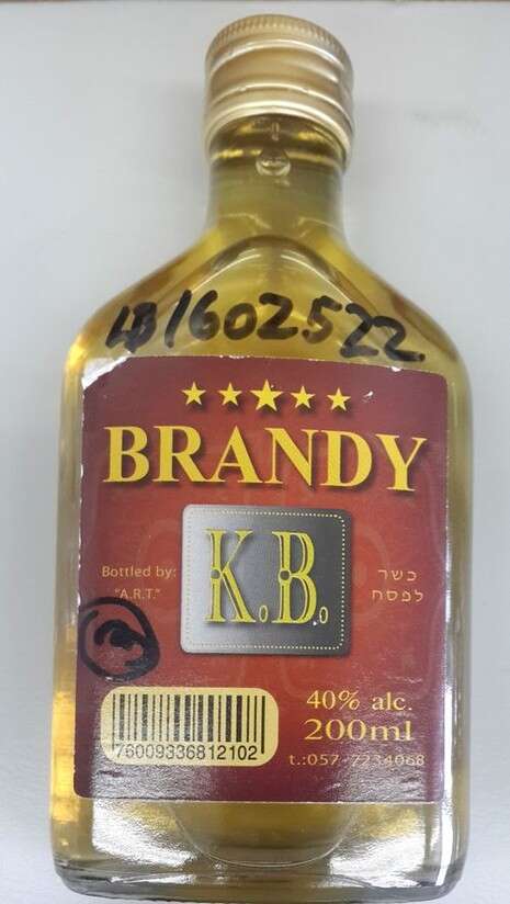 זיוף נוסף שנתפס הוא משקה אלכוהולי מסוג BRANDY K.B, בבקבוק בנפח 200 מ"ל עם 40% אלכוהול. בבדיקות מעבדה שנערכו למשקה התגלו רמות מתנול בכמויות גבוהות של פי 28 מהמצוין בתקן הישראלי. גם זיוף זה הכיל ברוצין.