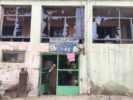 אדם מדבר בפתח חנותו, שזגוגיות החלונות שלה נשברו, ליד אתר הפיגוע בקאבול