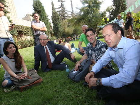 ברקת בקמפוס הר הצופים יושב על הדשא ומשוחח עם סטודנטים בשנה שעברה