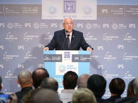 ריבלין נואם בכנס הרצליה. ''מתהדר במורשת ז'בוטינסקי, שאינו בקיא בה''.
