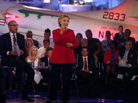 במסגרת העימות הוקצבו 30 דקות לכל מועמד, לענות על שאלות מהמנחה ומהקהל. הילרי קלינטון נשאלה שוב על השימוש שלה בשרת המייל הפרטי למיילים המסווגים, וניסתה להגן על שיקול הדעת שלה למרות החשיפה של תמלולי התחקורים שלה ב-FBI, בה ענתה להאשמות בעשרות מקרים "אני לא זוכרת". קלינטון, שהופיע ראשונה לאחר שזכתה בהטלת מטבע, התמודדה עם שאלה של קצין בצי האמריקני שאמר למועמדת: "אני הייתי מושלך לכלא אם הייתי מטפל במידע מסווג כפי שטיפלת". קלינטון השיבה: "עשיתי בדיוק מה שהייתי צריכה לעשות". בנוגע למדיניות החוץ של ארה"ב, התחייבה קלינטון כי "לא יהיו עוד כוחות של ארה"ב על הקרקע בעיראק".