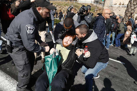 בהפגנה צעקו ''גדי תיזהר, רבין מחפש חבר''. שוטרים עוצרים מפגין מחוץ לקריה