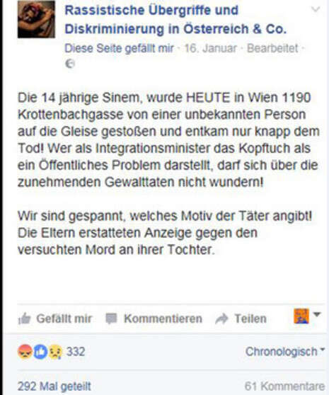 הנערה פרסמה בפייסבוק פוסט בו טענה כי אדם קרא לה "מחבלת" ודחף אותה אל פסי הרכבת בתחנה בווינה. אך המשטרה הודיעה כי לא נמצאו שום ראיות לכך שהאירוע התרחש – והיא עלולה לעמוד לדין על הגשת תלונת שווא