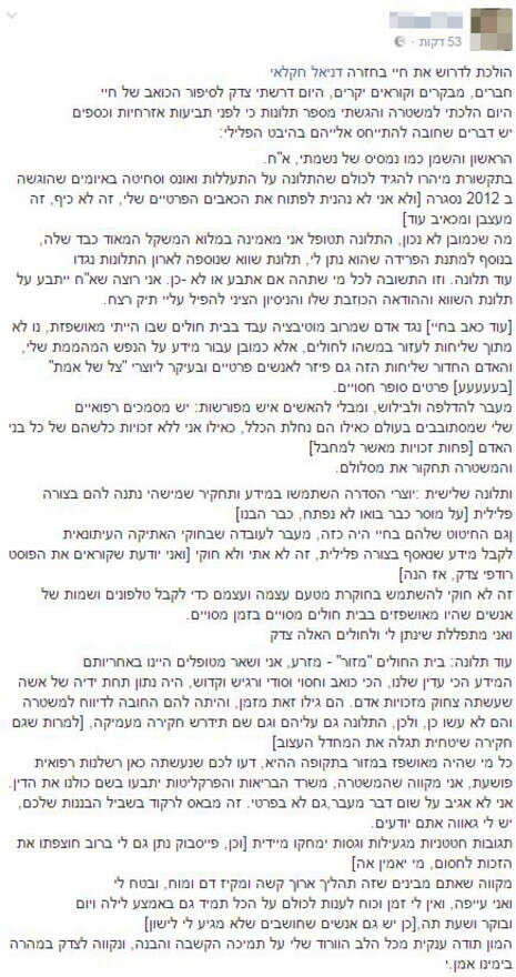 "במקביל התבקשתי בידי א"ק האמיצה והחזקה ובידי חברתה לימור נחמיאס ללוותה, במסגרת הגשת תלונתה המחודשת והמפורטת במשטרת מחוז תל אביב, כנגד מי שהיה בן זוגה - ואשר ביצע בה לטענתה מעשים כה איומים לאורך עשור וכן כנגד מי שפגעו לכאורה בחיסיון הרפואי הכי אישי שלה".