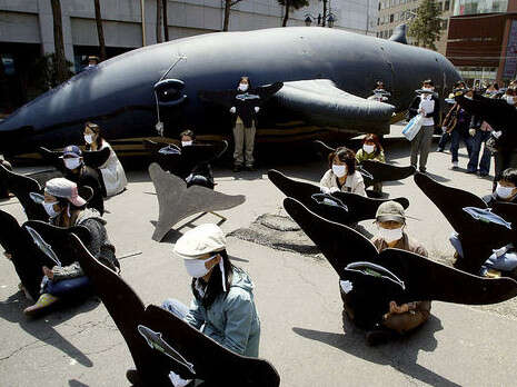 פעילי איכות סביבה מפגינים בדרום קוריאה במחאה נגד ציד הלוויתנים ביפן