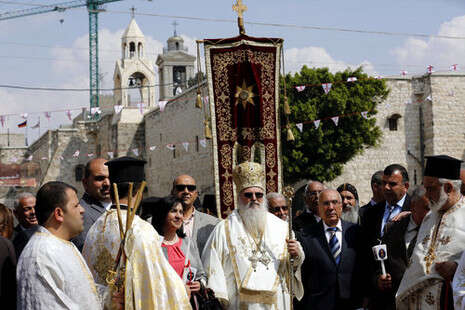 ראש הכנסיה היוונית אורתודוקסית בטקס שבת האור בבית לחם
