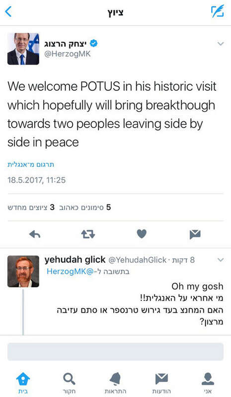 יו"ר האופוזיציה פרסם ברכה בטוויטר לרגל ביקורו של הנשיא טראמפ בארץ, אבל טעות כתיב מביכה באנגלית גרמה לו לספר לעולם כי הוא רוצה להיפרד מהפלסטינים בשלום, במקום לחיות לצדם בשלום