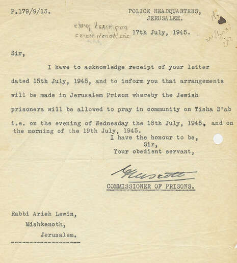 במכתב שנחשף התגלה כיצד הצליח הרב אריה לוין להשיג עבור האסירים היהודים אישור מיוחד לתפילת תשעה באב מנציב בתי הסוהר הבריטי