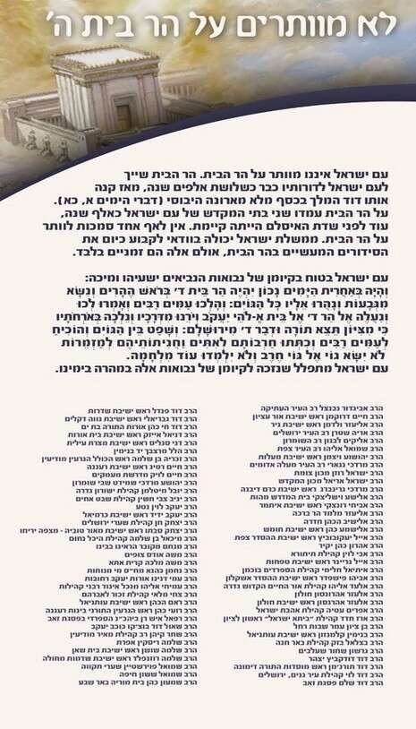 "עם ישראל איננו מוותר על הר הבית" נכתב בפתח הדברים. "הר הבית שייך לעם ישראל לדורותיו כבר כשלושת אלפים שנה, מאז קנה אותו דוד המלך בכסף מלא מארונה היבוסי (דברי הימים א, כא). על הר הבית עמדו שני בתי המקדש של עם ישראל כאלף שנה, עוד לפני שדת האסלאם הייתה קיימת" הם מדגישים. "אין לאף אחד זכות לוותר על הר הבית. ממשלת ישראל יכולה בוודאי לקבוע כיום את הסידורים המעשיים בהר הבית, אולם הם זמניים בלבד".