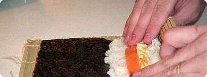טכניקות הגלגול מגוונות, אבל הדבר החשוב ביותר הוא שעובי הגליל יהיה כמה שיותר אחיד. במסעדות נהוג להשתמש בחצי דף של אצות, מטעמי קמצנות, אבל אל תנסו חסכנות מסוג זה בבית - זה מאוד קשה. פרסו את מחצלת הגלגול והניחו עליה דף אצה כאשר הצד המבריק כלפי מטה והפסים מונחים לרוחב. הרטיבו מעט את שתי הידיים וקחו מהאורז חופן. כדי שהסושי ישמור על צורתו, האורז צריך להיות כמה שיותר דחוס, ולכן דחסו את החופן בשתי ידיים ליצירת כדור. הניחו את הכדור במחצית הקרובה אליכם של האצה והשטיחו אותו כך שיכסה את רוב המחצית התחתונה של האצה. נסו להגיע כמה שיותר קרוב אל השוליים הצדדיים, אך אל תעשו מזה מלחמה.