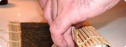 הגלגול ידרוש מכם כמה ניסיונות עד שתגיעו לגליל משביע רצון. יש להרים את חלקה הקרוב אליכם של מחצלת הגלגול (החלק שבו נמצא האורז) ולגלגל אותו קדימה לאט עד ששולי המחצלת יגעו באורז. יש להפעיל לחץ על האורז עם שולי המחצלת כדי לדחוס אותו כמה שיותר. עכשיו משחררים ומגלגלים קדימה קצת, ושוב דוחסים. חוזרים על הפעולה עד שהמחצלת הפוכה לגמרי, ואז מגלגלים חזרה וסוגרים את כל הגליל בתוך המחצלת למשך כחצי דקה. הלחות שבאורז נספגת באצה ומרככת אותה, וכאשר חלק האצה שבו אין אורז מתגלגל מסביב לחלק שבו יש אורז, הוא סופג ממנו לחות והלחות היא זו שמדביקה את השוליים ושומרת על צורתו של הגליל. כל עוד הגליל בתוך המחצלת, אפשר להסתכל מהצדדים ואם חסר אורז בשוליים, אפשר להוסיף קצת ולדחוס אותו פנימה עם האגודל. אני בדרך כלל מכין את כל הגלילים ושם אותם בצד, ובסוף מבצע את החיתוך, אבל זה כמובן לא חובה. עוביו של הגליל אמור להיות בסביבות 3-4 סנטימטר בסופו של דבר.