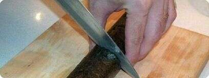 למרות שאף אחד לא מונע מכם לאכול את הסושי ישר מהגליל, הנוהג הוא לחתוך כל גליל ל-6 עד 8 חתיכות בגודל ביס. האצה לא נחתכת בקלות ואם לא נזהרים, אנחנו עלולים למעוך את הגליל היפה שלנו ולכן חשוב פה להשתמש בסכין חדה מאוד, ולא משוננת. מניחים את הגליל על משטח החיתוך, מרטיבים את הסכין במים (חובה! - המים מרככים את האצה בנקודת החיתוך ועוזרים לחיתוך להיגמר בשלום) וחותכים את הגליל באמצעו בתנועת ניסור איטית. אפשר פשוט לחתוך לפי העין, אבל הכי קל לחתוך באמצע הגליל ולסובב את החצי הימני כך שיעמוד ליד השמאלי ואז לחתוך את השניים ביחד לשלושה או ארבעה חתיכות כל אחד. זה גם חוסך זמן וגם יוצא מדויק יותר. ביפן, אם החיתוך יצא לא מדויק, הטבח חייב להתאבד כדי להגן על הכבוד של המקצוע (סתם).